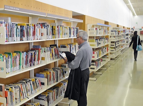 La biblioteca Nou Barris està situada en una de les parts de l'antic Institut Mental de la Santa Creu , que va fundar el doctor Pi i Molist el 1889. L'edifici de l'Institut Mental de la Santa Creu fou dissenyat per l'arquitecte Josep Oriol i Bernadet a partir del projecte del Dr. Pi i Molist. Un cop acabat, les dimensions del complex eren impressionants: 700 metres de llarg per 200 d'ample, comparable en extensió al Palau de Versalles. Estava format per dotze pavellons aïllats, perpendiculars a dues crugies paral·leles entre sí, amb extensos hemicicles als dos extrems, i comptava fins i tot amb una església. Al voltant d'un mòdul central s'articulaven les dues ales, que albergaven un departament general per a cada sexe.