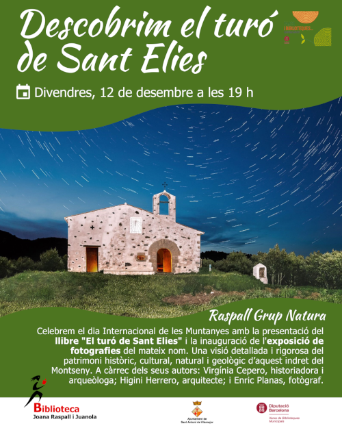 Celebrem el dia Internacional de les Muntanyes amb la presentació del llibre El turó de Sant Elies i la inauguració de l'exposició de fotografies del mateix nom. Una visió detallada i rigorosa del patrimoni històric, cultural, natural i geològic d'aquest indret del Montseny.