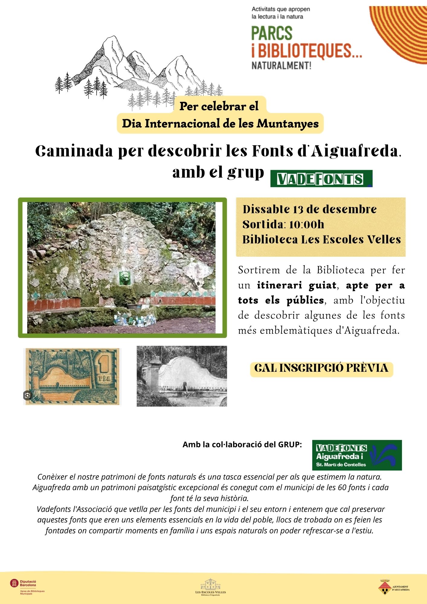 Sortirem de la Biblioteca a les 10:00 per fer un itinerari guiat, apte per a tots els públics, amb l'objectiu de descobrir algunes de les fonts més emblemàtiques d'Aiguafreda.