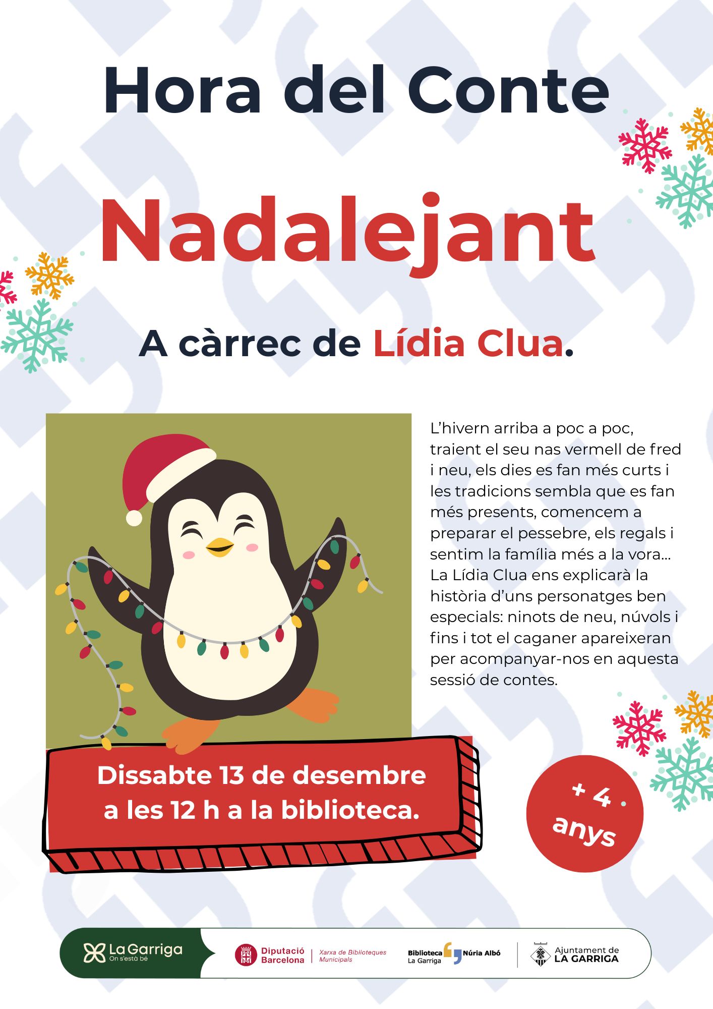 La Lídia Clua ens explicarà la història d’uns personatges ben especials: ninots de neu, núvols i fins i tot el caganer apareixeran per acompanyar-nos en aquesta sessió de contes.
