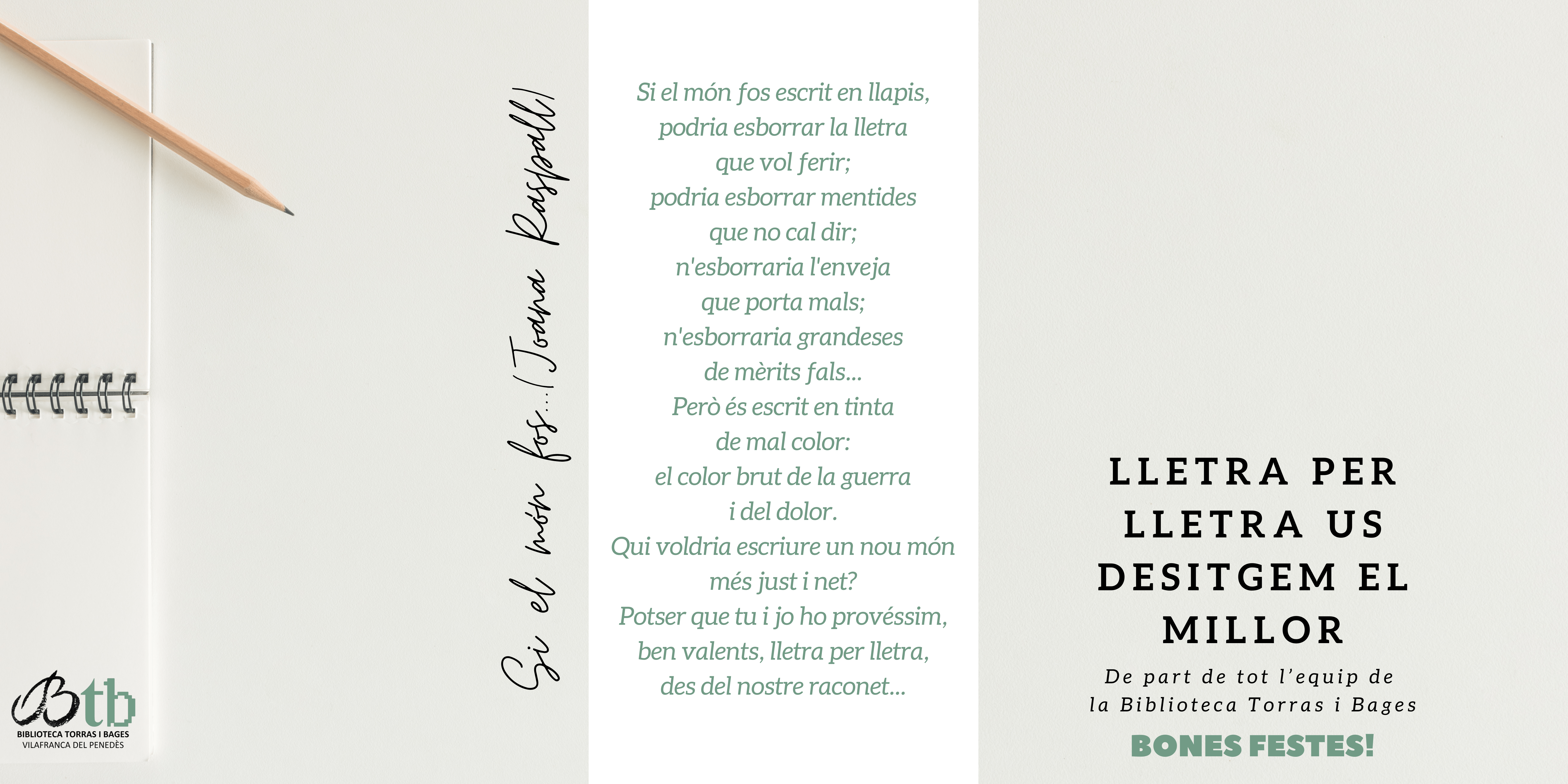 "Lletra per lletra, des del nostre raconet", ens fem servir de la poesia de la Joana Raspall per a desitjar-vos Bones Festes, de part de tot l'equip de la Biblioteca Torras i Bages!