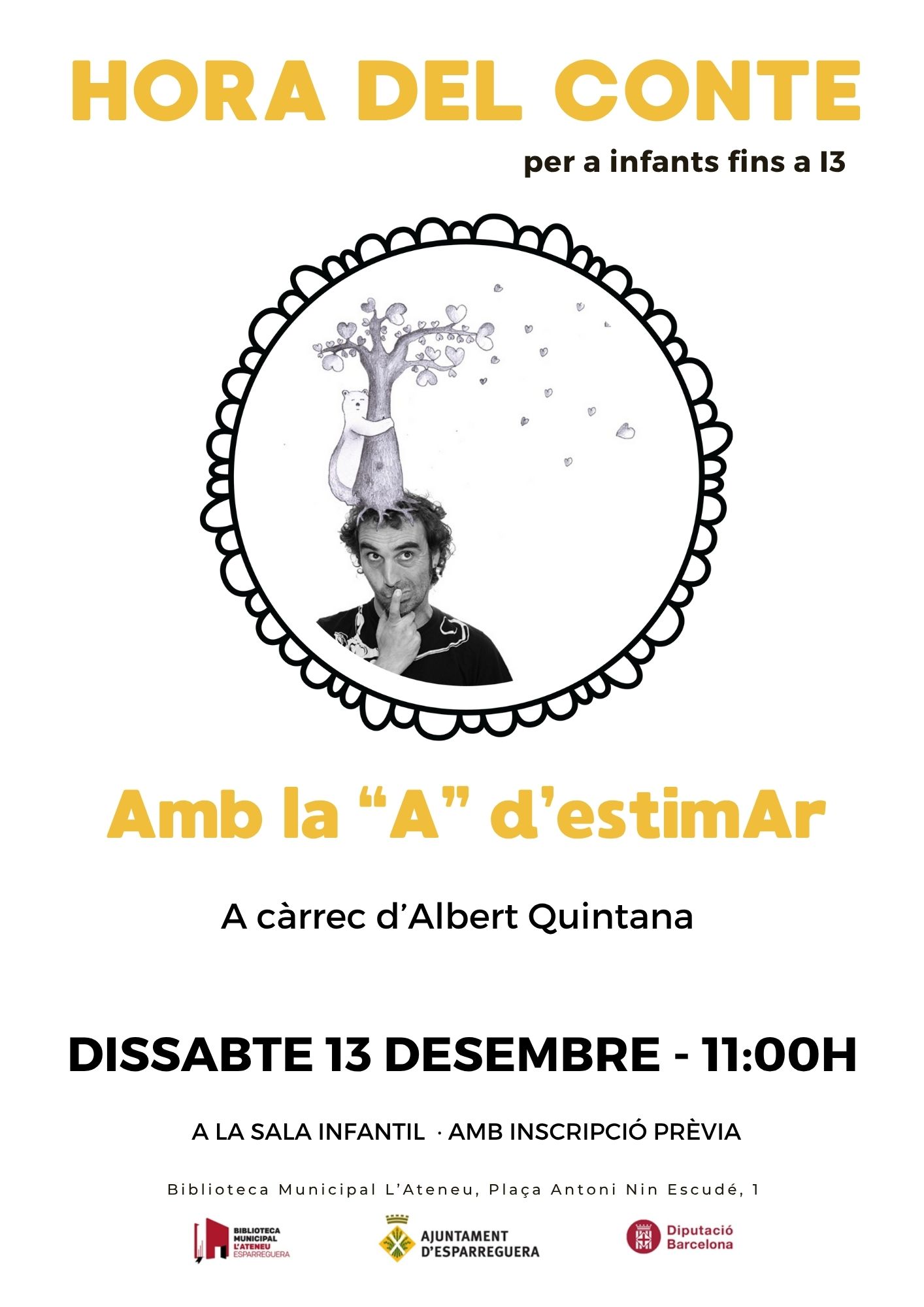 El dissabte 13 de desembre no us perdeu l'Hora del conte per a nadons "Amb la A d'estimar", una proposta de contes per a addictes als petons, a les abraçades i als amants de la xocolata. Explicarem contes d’aquí i d’allà, històries curioses on els protagonistes d’alguna manera o altra s’acaben fent petons, abraçades o somriures. L’activitat anirà a càrrec d’Albert Quintana (Gra de sorra) i està pensada per a infants fins a Infantil 3 (I3) acompanyats d’un adult.
