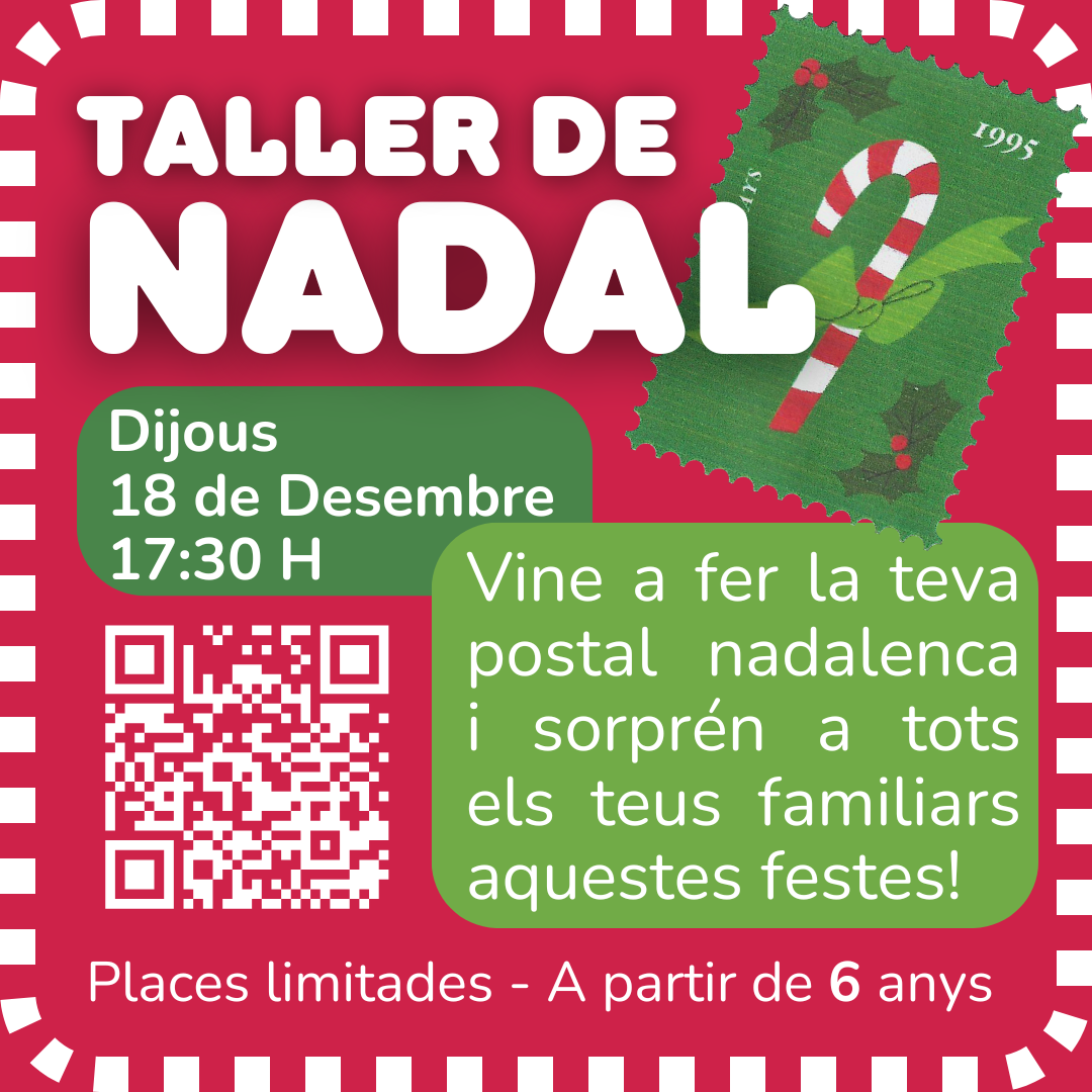 En aquest taller crearem postals nadalenques plenes de color i creativitat perquè les puguis enviar a totes les teves amistats i familiars. Activitat per a infants a partir de 6 anys. Cal inscripció prèvia a la web de la biblioteca.