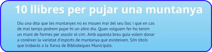 Hi ha moltes maneres d'apropar-se a la muntanya i són diversos els esports o disciplines amb els quals podem gaudir de la natura. La guia que presentem pretén fer un breu repàs d'aquestes modalitats i dels tipus de llibres que podeu trobar a les biblioteques sobre el tema.