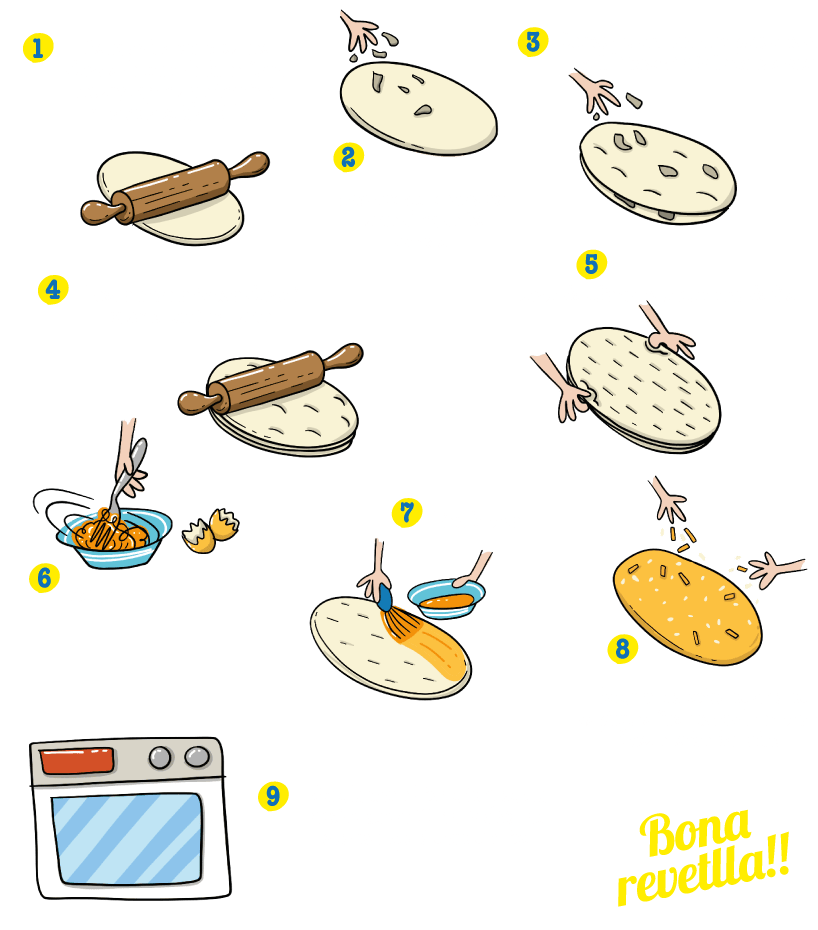 9.- Posa la coca a la safata del forn a temperatura màxima durant 10 minuts o bé