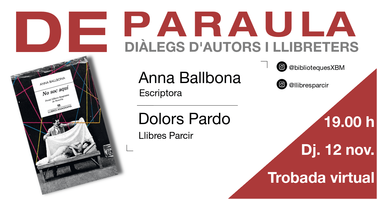 Dijous 12 de novembre a les 19:00 h, l'autora Anna Ballbona va conversar amb la Dolors Pardo de Llibres Parcir, sobre el llibre No soc aquí.