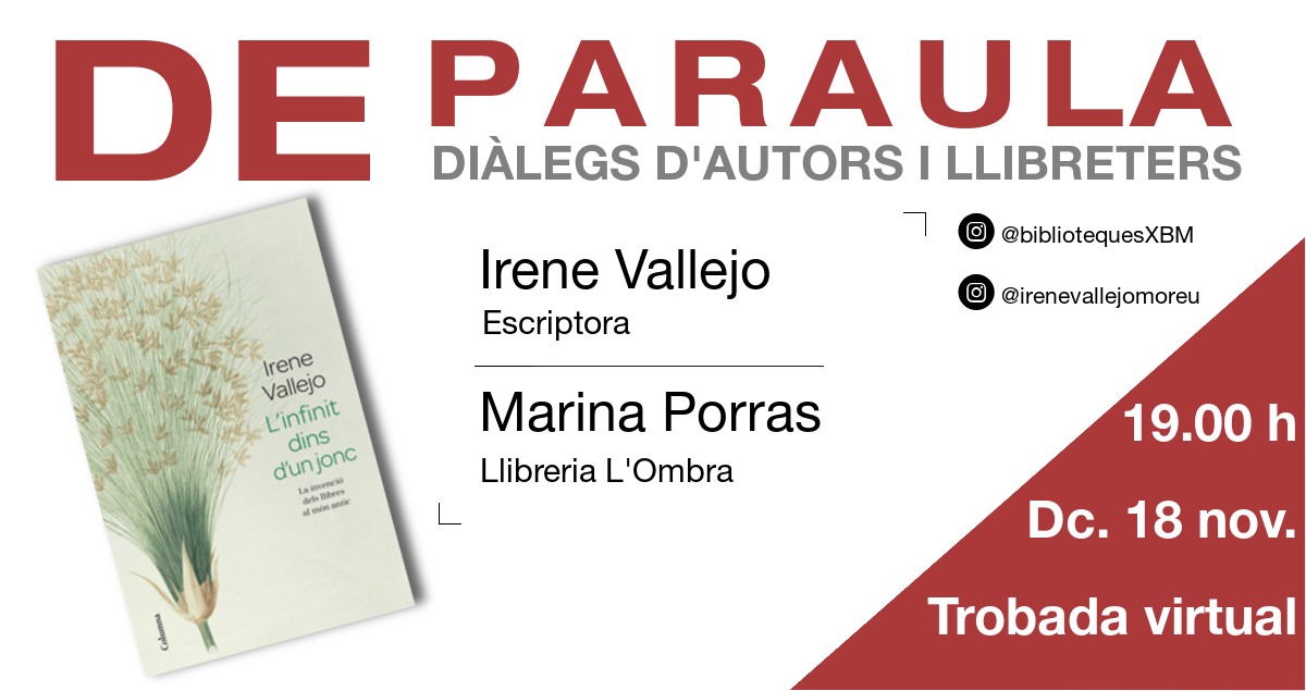 Dimecres 18 de novembre a les 19:00 h, l'autora Irene Vallejo va conversar amb la Marina Porras de Llibreria L'Ombra, sobre el llibre L'infinit dins d'un jonc.