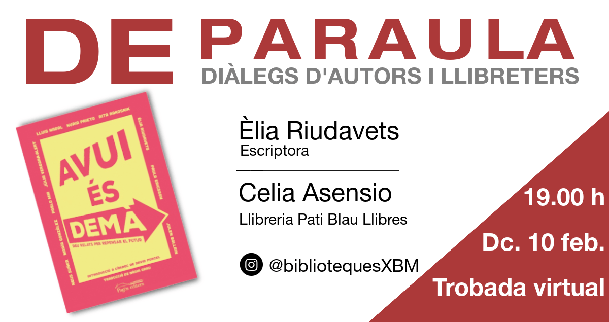Dimecres 10 de febrer a les 19:00 h, l'escriptora Èlia Riudavets va conversar amb Celia Asensio de Pati Blau Llibres, sobre el llibre Avui és demà.