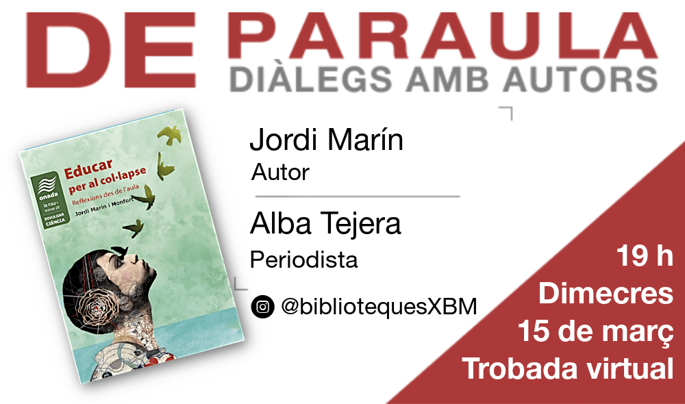 Dimecres 15 de març a les 19:00 h, l'escriptor Jordi Marín va conversar amb la periodista Alba Tejera sobre el seu llibre Educar per al col·lapse.